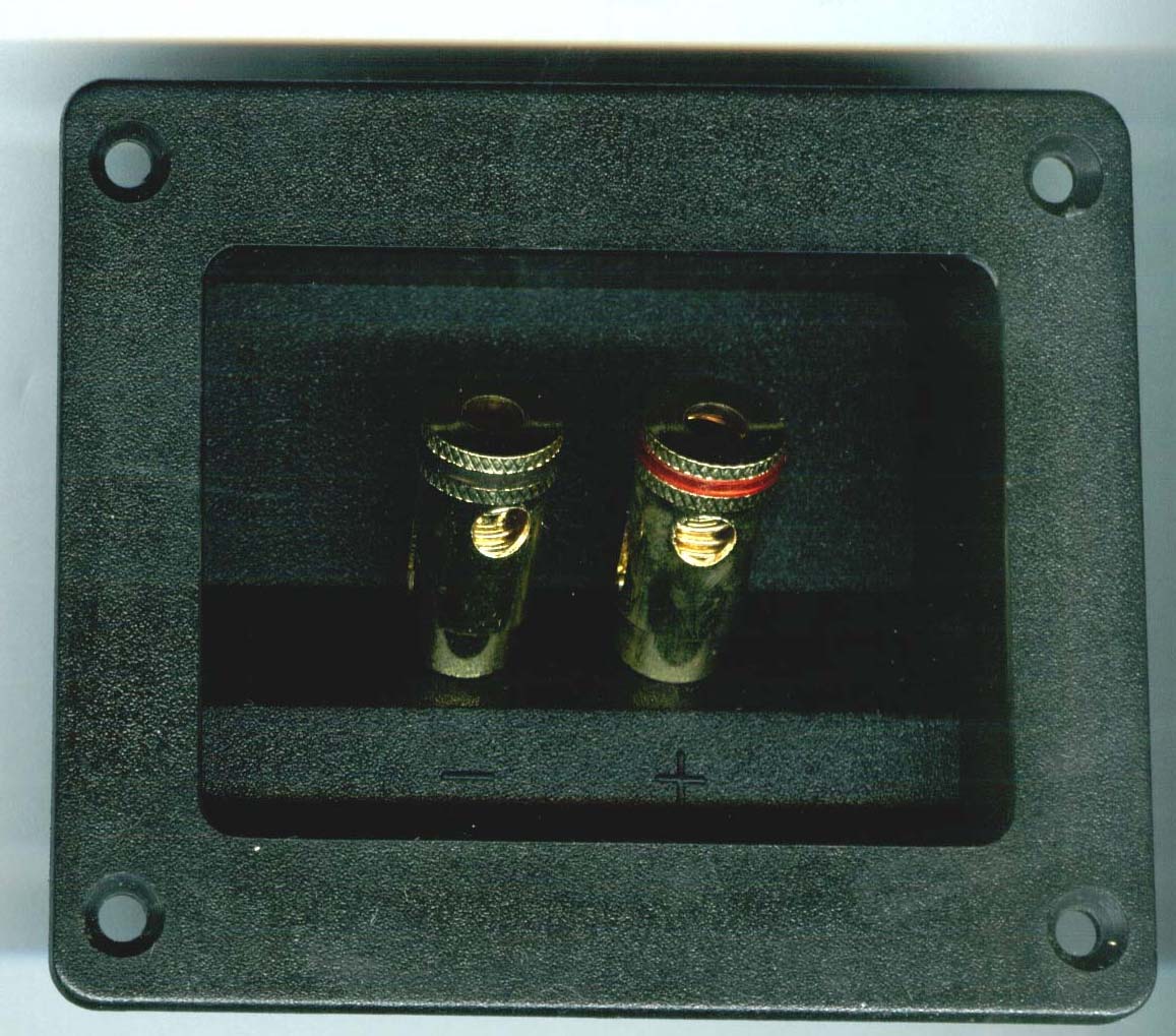 Spring Loaded gold binding posts (speaker jacks) with plastic mounting plate. Through hole mounting for 6AWG max or accepts standard banana plugs. 4 1/8" diameter plate with 4 screw holes